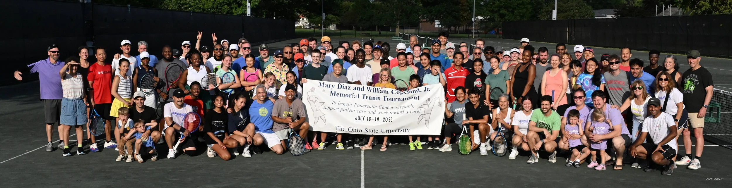 /Many thanks to everyone who helped make the 19th Annual Mary Diaz & William Copeland, Jr. Memorial Tennis Tournament a success. Over 100 tennis players came to participate in doubles drills, enjoy pizza, and catch up with friends on Friday evening, July 18th, at Northam Park. It was a great day for tennis on Saturday, July 19th. One hundred and fifty players participated in round-robin doubles play at The Ohio State University. During the afternoon, players took a break from play to hear from Dr. Ann Noonan of The Ohio State University Comprehensive Cancer Center and to learn about the tournament honoree, Roslee Jaars-Meyer. The end of the tournament picnic featured the presentation of two awards. The Sue Simon Spirit Award was given to Caitlin Kelleher in honor of her long-time enthusiastic commitment to the tournament. And the Ezekiel Davis Sportsmanship Award was presented to Chloe McClymont, whose positive attitude and respect for her opponents are evident every time she steps on the court. To date, the 19th annual tournament has raised over $72,000 to support, treat, and cure those affected by pancreatic cancer. A big shout-out to everyone who came out to support the cause!